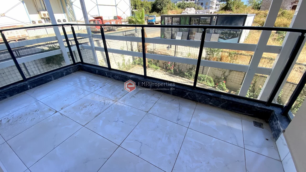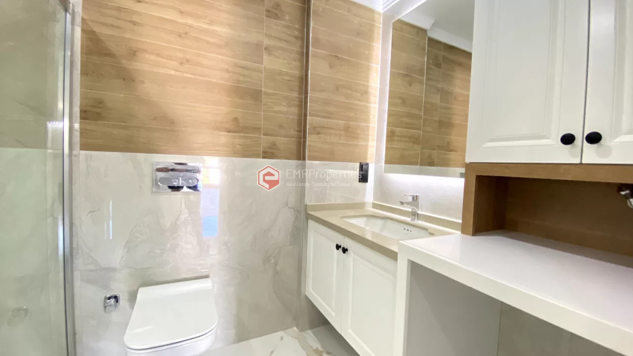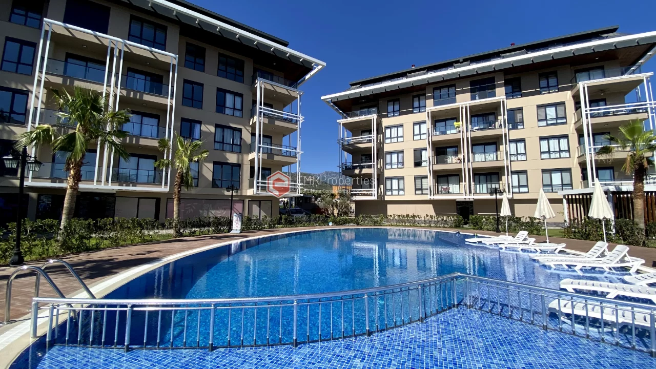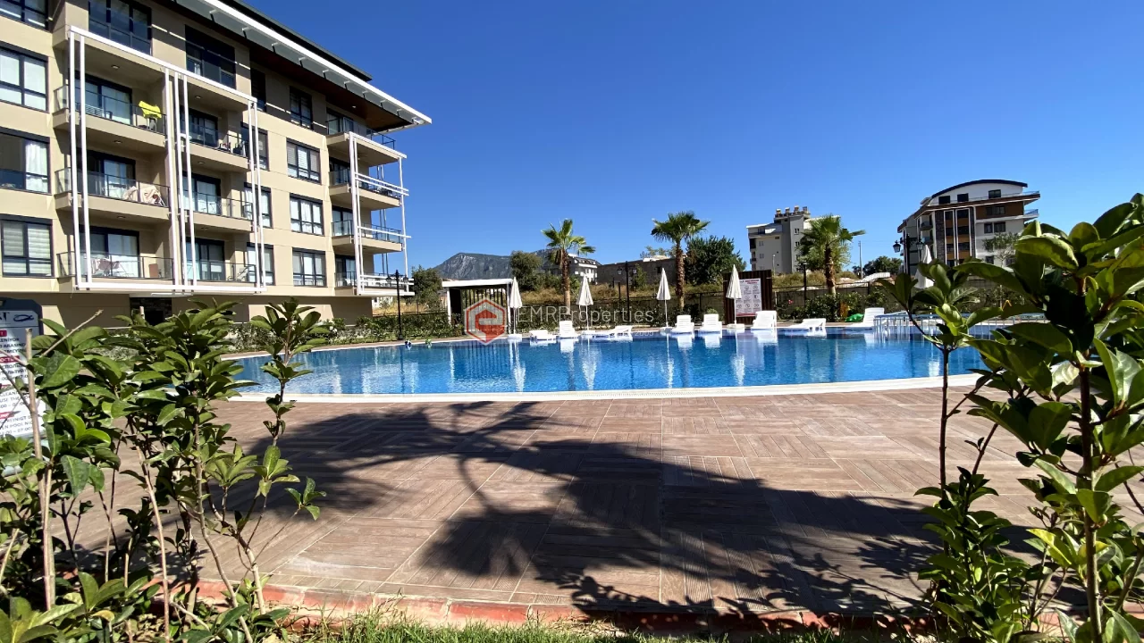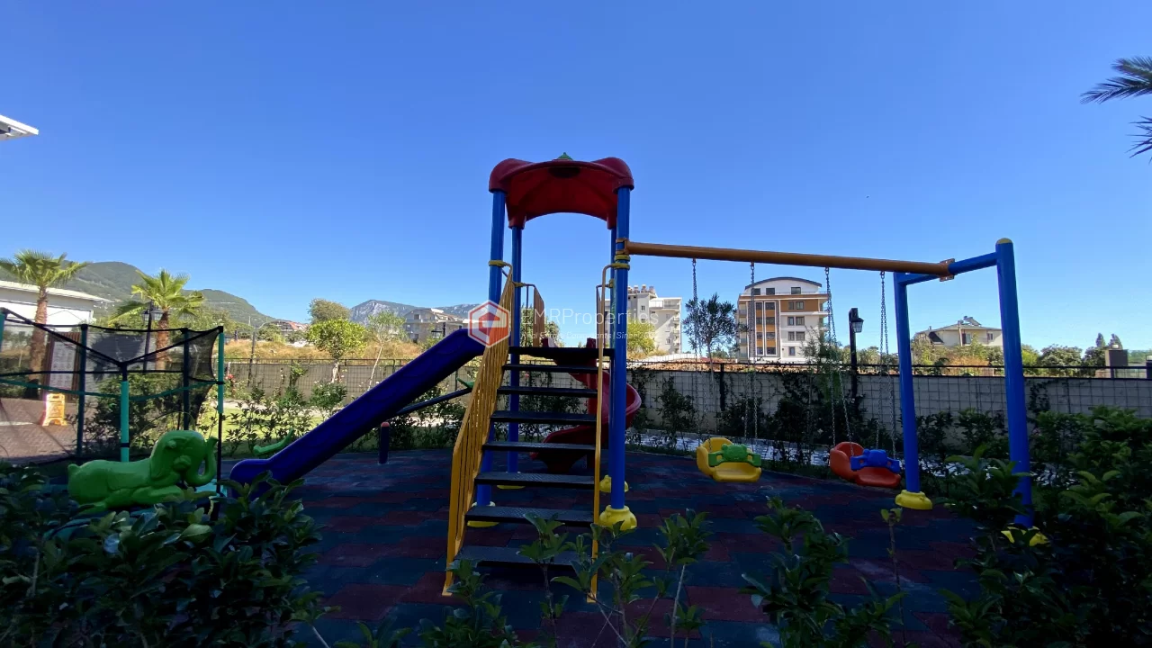 Ovaj novi stan ima 110m2. Stan ima 2 spavaće sobe, 1 dnevni boravak, dva moderna kupatila i američku kuhinju. Stan ima 2 balkona na zapadnoj i južnoj fasadi. Tu su otvoreni bazen, sauna, tursko kupatilo, teretana i igralište, zajednička bašta. Apartman se nalazi na 1. katu i nudi pogled na bazen, vrt i prirodu. Stan se nalazi u srcu Alanje, 2 km od mora i 1 km od bolnice i trgovačkih centara.