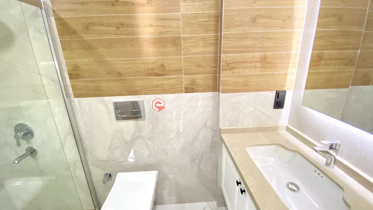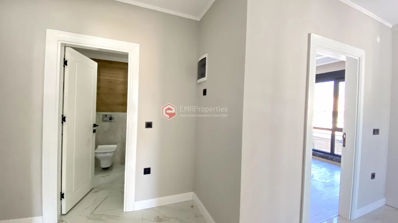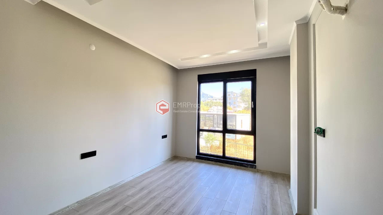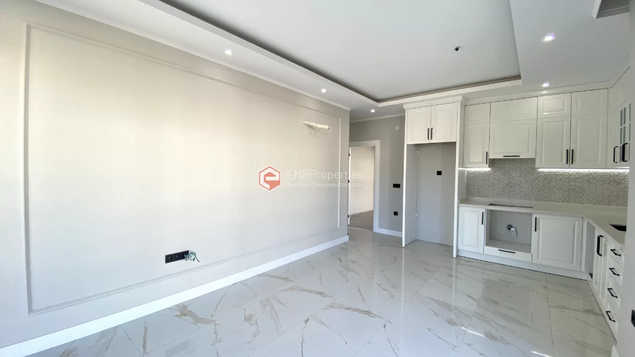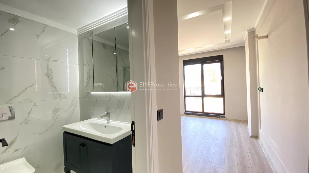 Ovaj novi stan ima 110m2. Stan ima 2 spavaće sobe, 1 dnevni boravak, dva moderna kupatila i američku kuhinju. Stan ima 2 balkona na zapadnoj i južnoj fasadi. Tu su otvoreni bazen, sauna, tursko kupatilo, teretana i igralište, zajednička bašta. Apartman se nalazi na 1. katu i nudi pogled na bazen, vrt i prirodu. Stan se nalazi u srcu Alanje, 2 km od mora i 1 km od bolnice i trgovačkih centara.