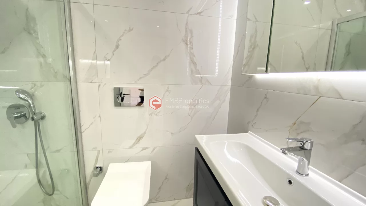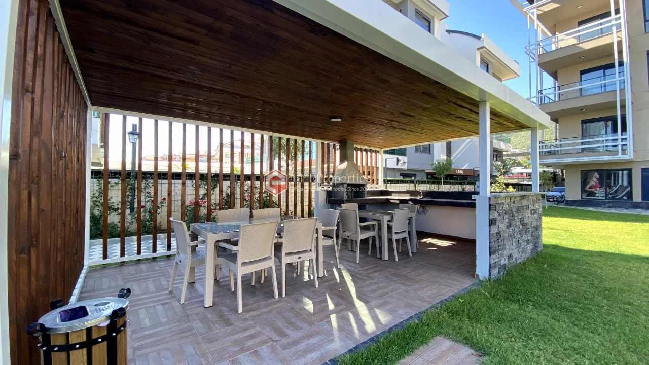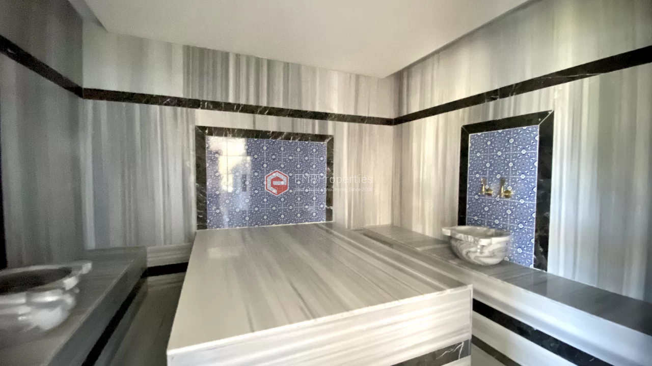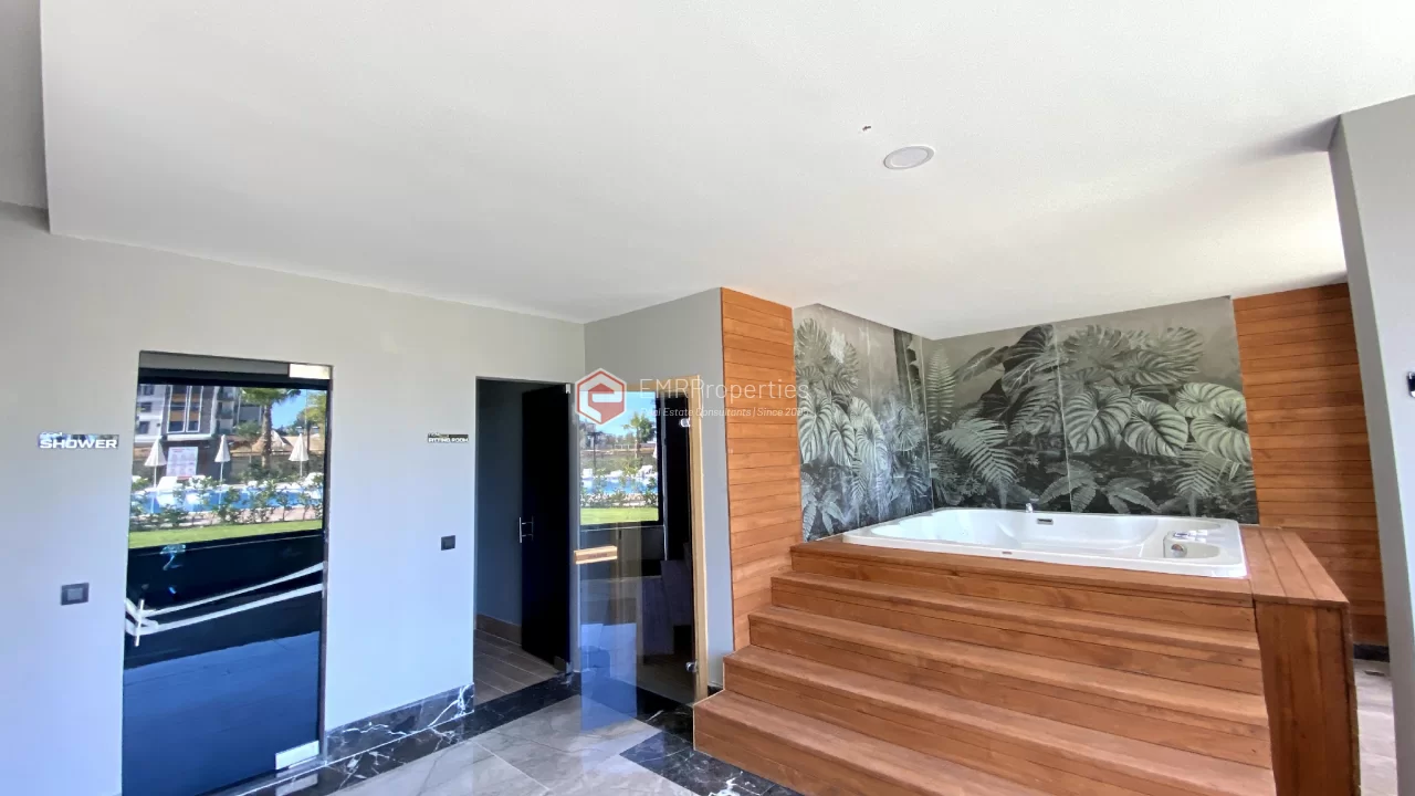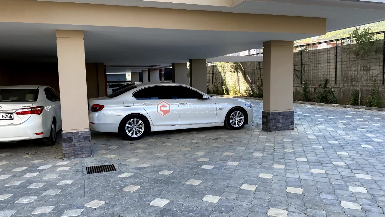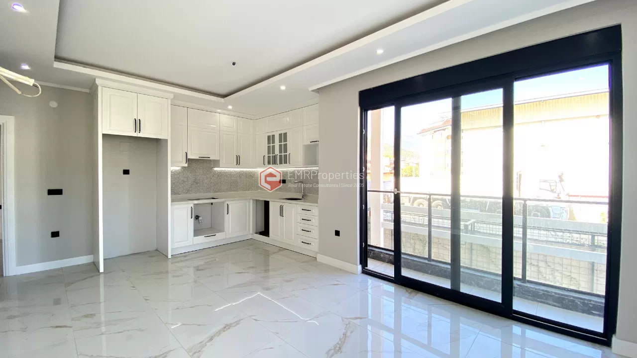 Ovaj novi stan ima 110m2. Stan ima 2 spavaće sobe, 1 dnevni boravak, dva moderna kupatila i američku kuhinju. Stan ima 2 balkona na zapadnoj i južnoj fasadi. Tu su otvoreni bazen, sauna, tursko kupatilo, teretana i igralište, zajednička bašta. Apartman se nalazi na 1. katu i nudi pogled na bazen, vrt i prirodu. Stan se nalazi u srcu Alanje, 2 km od mora i 1 km od bolnice i trgovačkih centara.