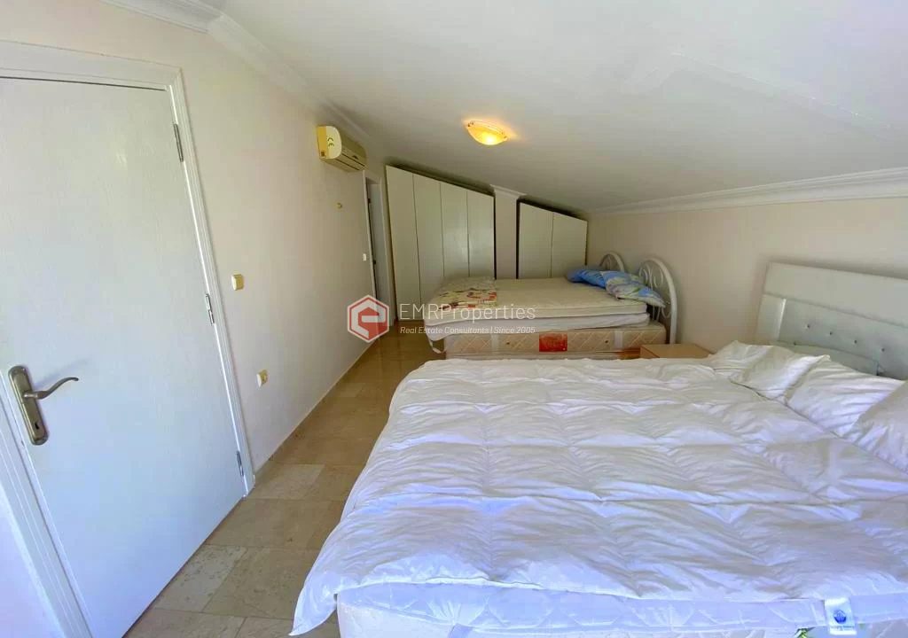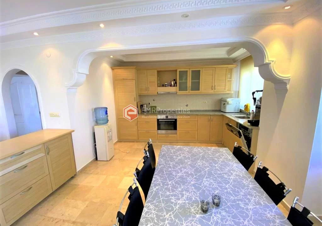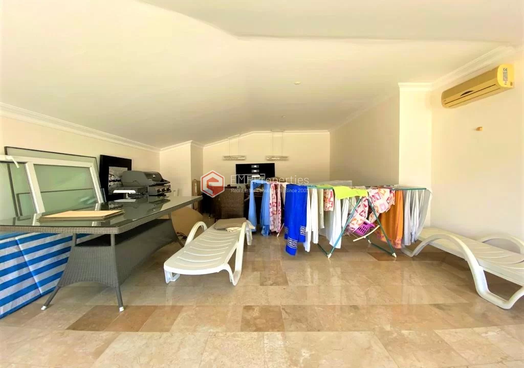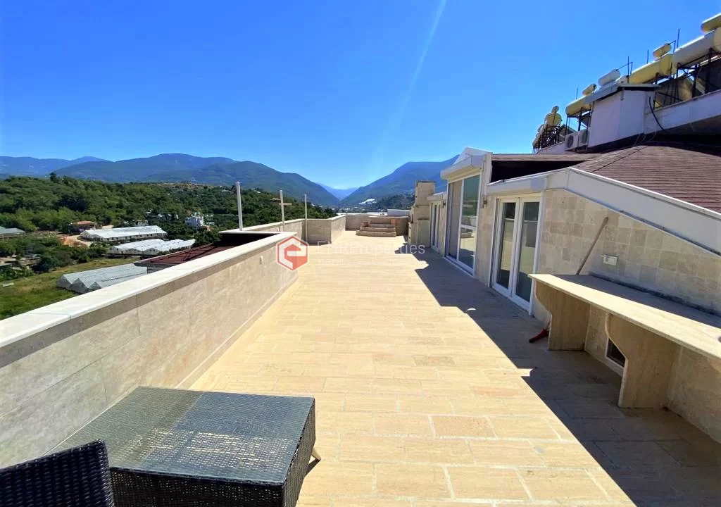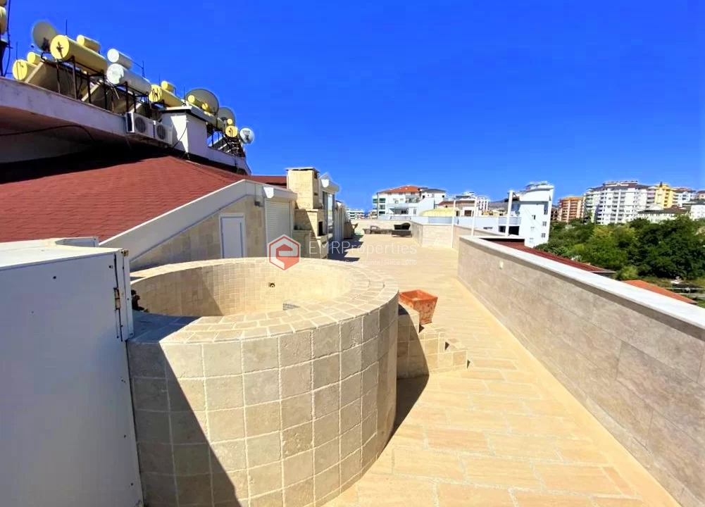 Located in Tosmur, the shining star of Alanya, the duplex-penthouse has 4 bedrooms, an American kitchen, a bright and breeze living room, 2 bathrooms and 2 large balconies. On the 9th floor there is a terrace all around and there is also a whirlpool. The building was built in 2010. As social activities, there is a pool, a camellia and a car park. The building has an elevator, a generator, a caretaker and there is also security cameras. The penthouse is only 500 meters walking distance from the sea.