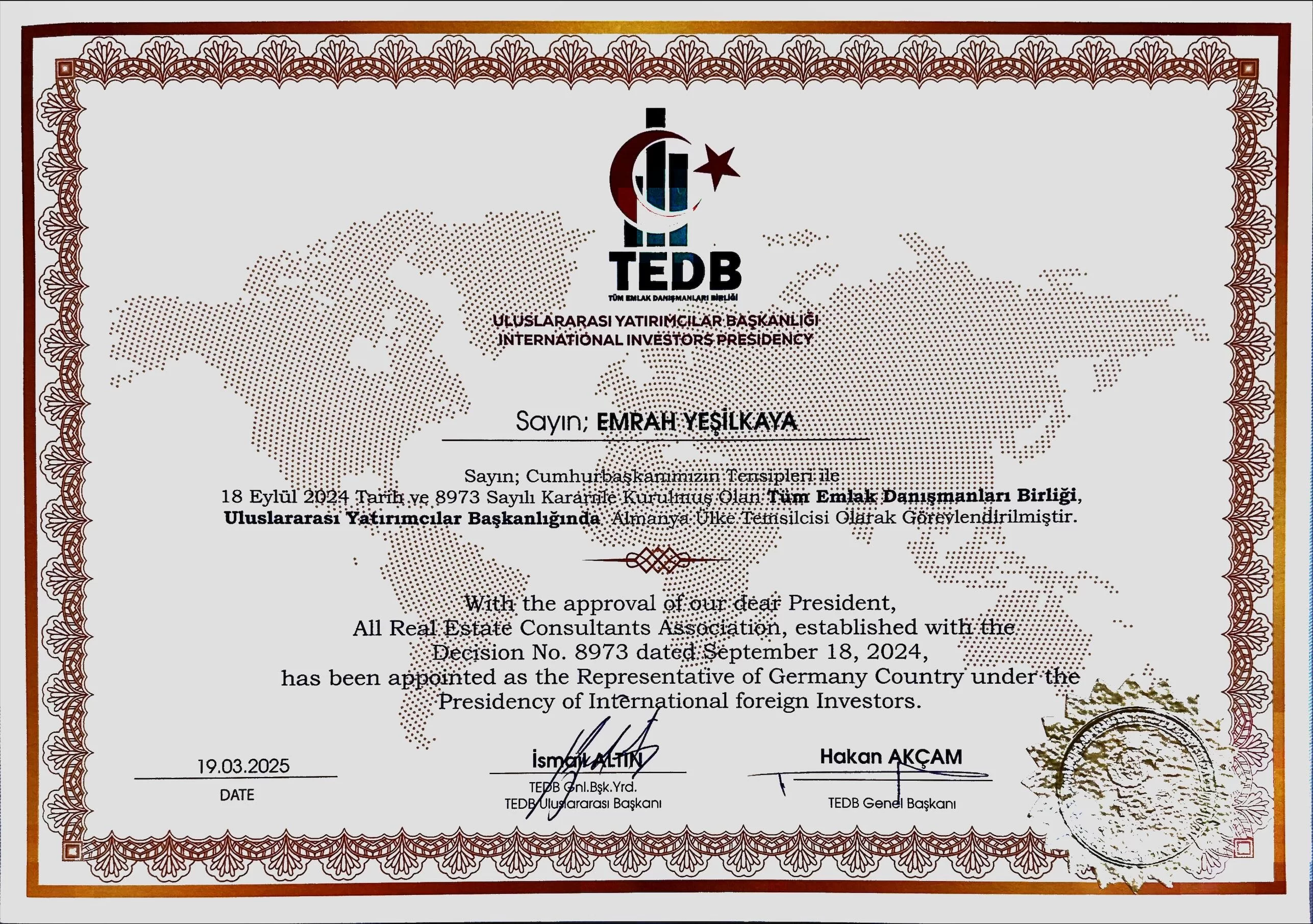 We are proud to announce that Emrah Yesilkaya, founder of EMR Properties, has been officially appointed as the Germany Country Representative by the International Investors Presidency of TEDB (All Real Estate Consultants Association).