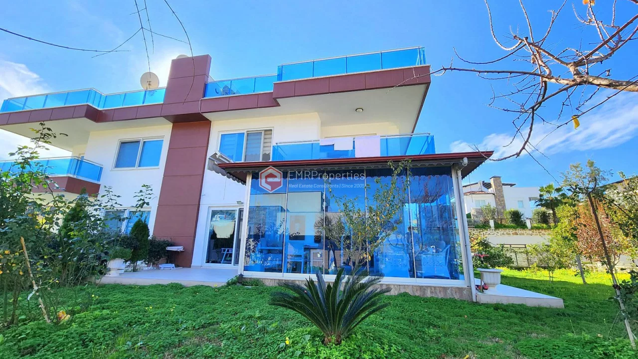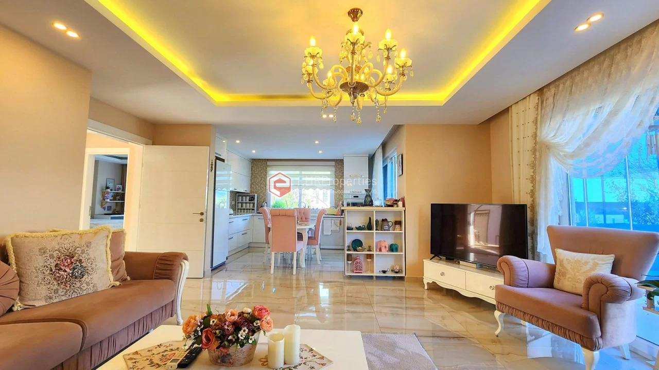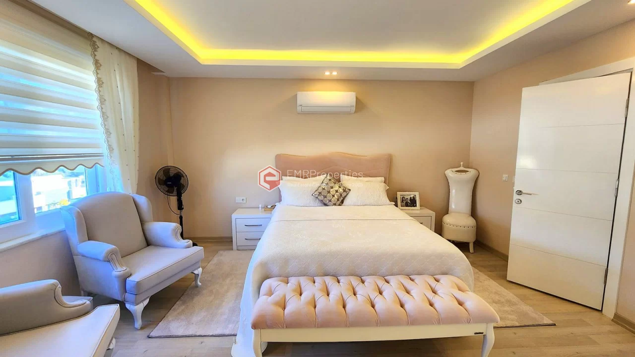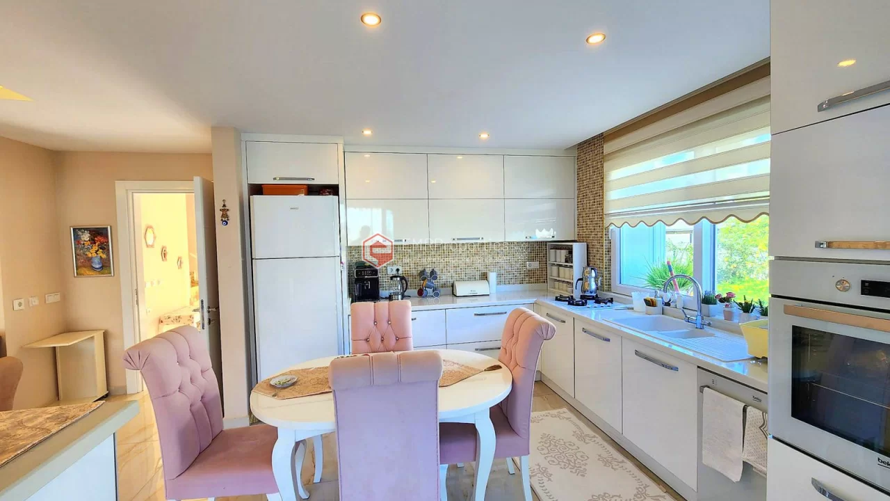This twin villa is located in Kargicak, an ecologically clean area, 4 km from the sea. The villa has 180 square meters of living space. Luxury furnished villa has 3 bedrooms, 1 living room with American kitchen and 3 bathrooms. The villa with full activity has an infrastructure in the concept of a hotel. From the windows of the south and west facing villa, you will have magnificent views of lush mountains, pine forests and banana groves.